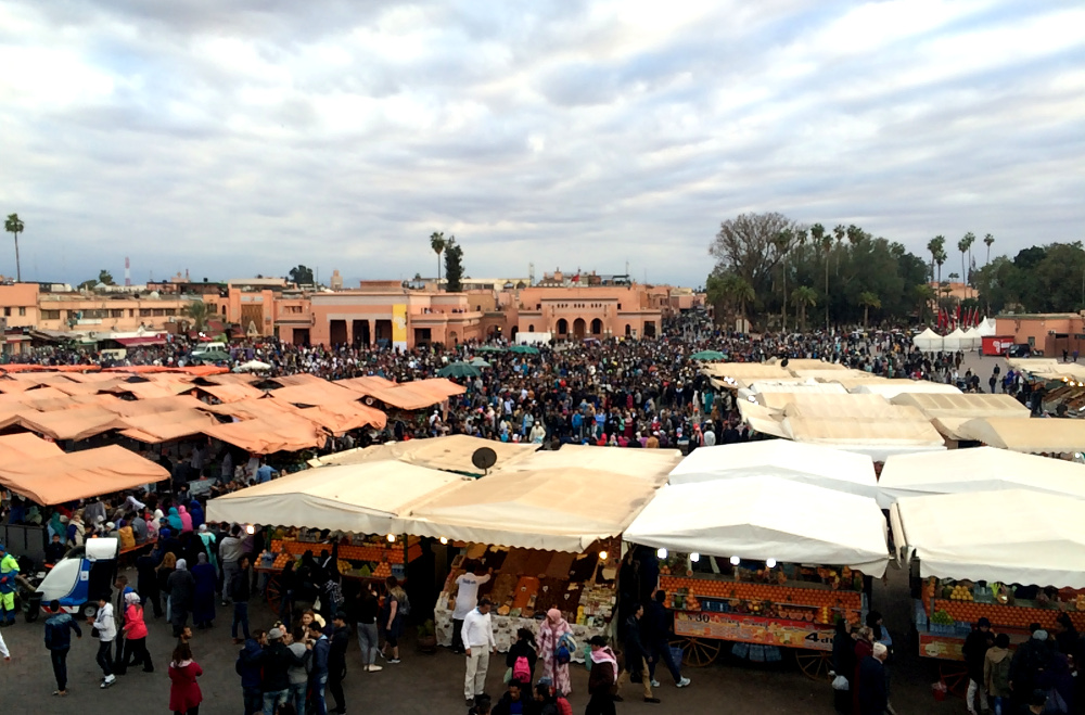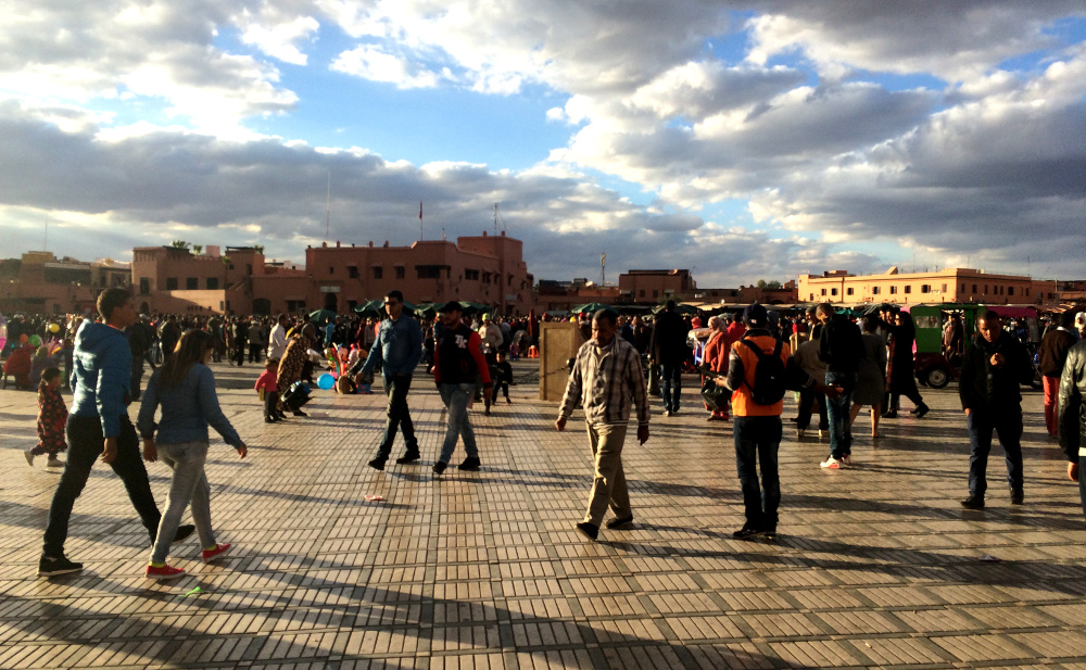 Die zuvor bekommene Führung durchs Riad erwies sich gleich als sinnvoll, denn wir fanden den Ausgang aus dem verwinkelten Riad nicht mehr. 😀 Nachdem uns ein hilfsbereiter Hotelmitarbeiter geholfen hatte, standen wir mitten im Trubel und machten uns auf den Weg zum Djemaa el Fna und den Souks. Dabei mussten wir mehrmals die Straßen überqueren, das war aber bei dem hektischen marokkanischen Verkehr gar nicht so einfach. Zum Glück konnten wir bereits bei der zweiten Straßenüberquerung wieder mit unseren halsbrecherischen, in Asien erworbenen Künsten auftrumpfen – das ist wohl wie Fahrradfahren. 🙂