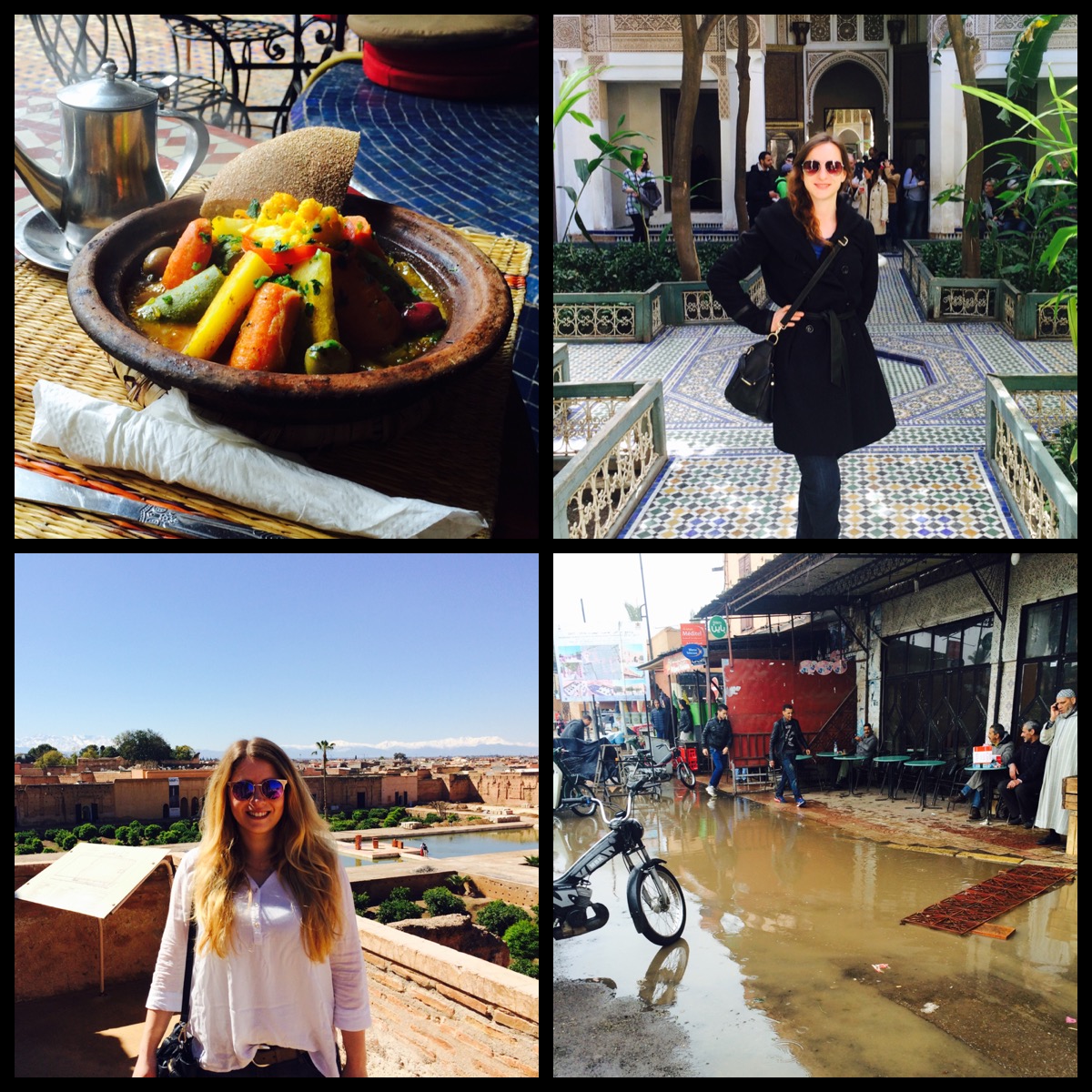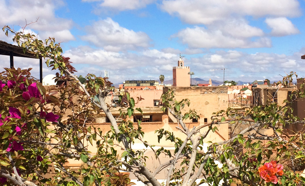 Direkt nach der Ankunft machten wir uns mit einem etwas überteuertem Taxi auf den Weg zu unserem Traum-Riad. Dort wurden wir herzlich mit einem Minztee empfangen und bekamen anschließend eine Führung durchs Riad. Auf der Dachterasse vor unserem Zimmer hieß uns die Sonne Afrikas willkommen. Sofort nahmen wir das kleine aber feine Zimmer in Beschlag und machten uns fertig, um die Medina zu erkunden.