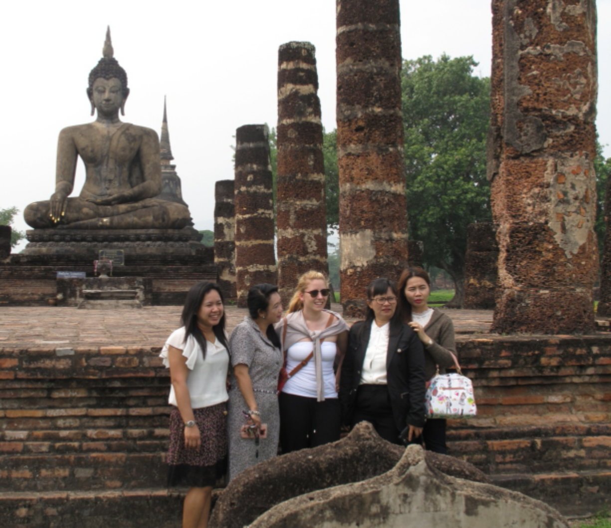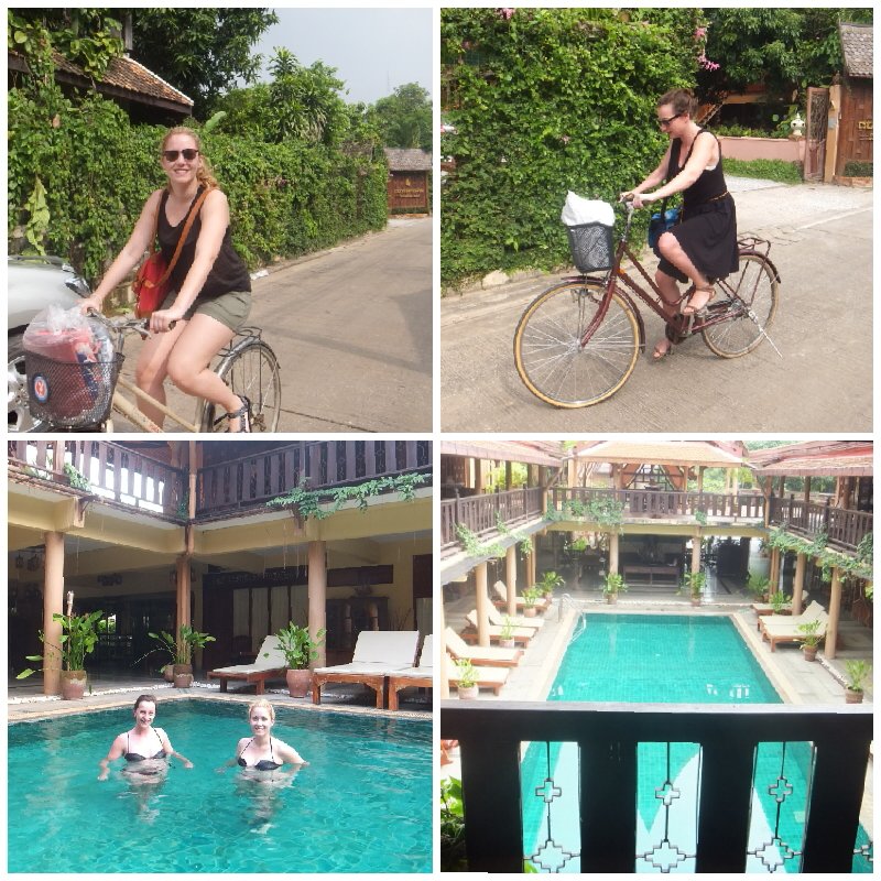 Nun zum heutigen Tag – wir haben den Sukhothai Historical Park, welcher von der UNESCO zum Weltkulturerbe ernannt wurde, besichtigt! Hier gibt es steinerne Bhuddafiguren, Tempelruinen und einen großen Park zu erkunden. Dazu haben wir uns schicke, pinke und voll funktionstüchtige Drahtesel ausgeliehen. Bei gefühlten 50 Grad (tatsächlich 35 Grad) und einer Luftfeuchtigkeit von annähernd 100 Prozent fuhren wir behände durch den Park und staunten über die mystisch wirkenden Ruinen. Erneut zogen wir uns einen überraschenden Sonnenbrand zu. Wir waren mit LSF 50 eingecremt.