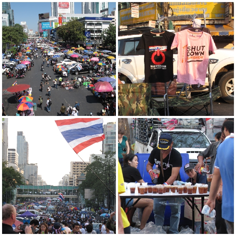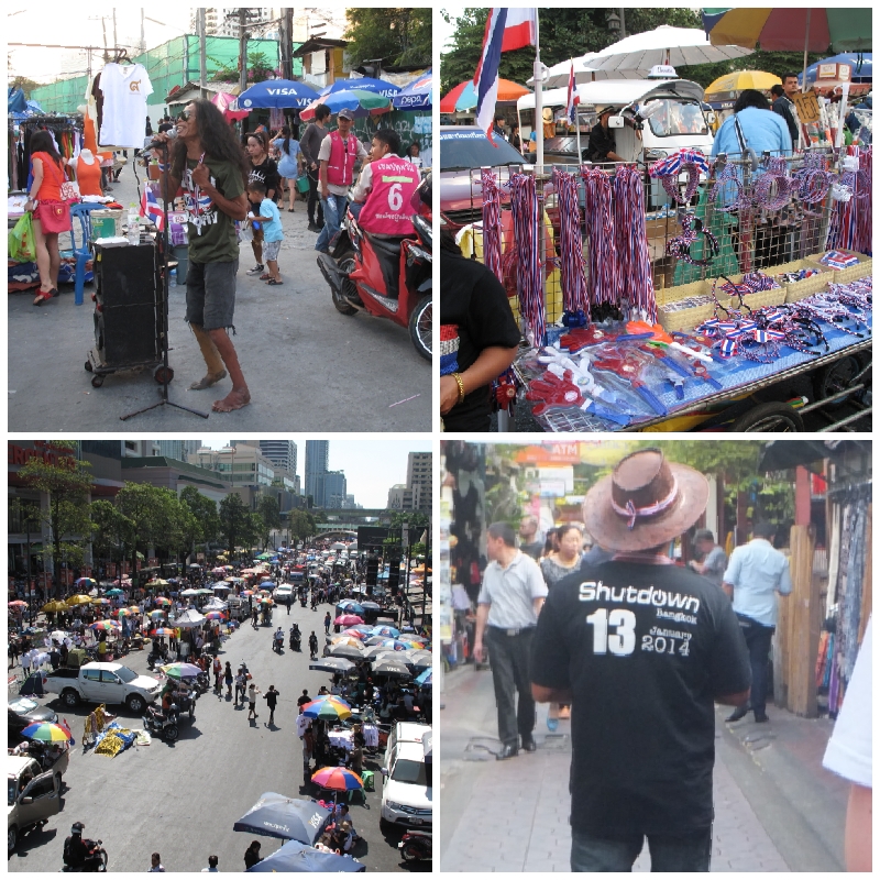 Auf dem Weg zu einem Einkaufszentrum sind wir wieder einmal mitten in die (friedlichen) Proteste geraten. Die Stimmung am Siam Square und in den angrenzenden Straßen war wie auf einem Festival mit Straßenständen und Musik. Bei dem sogenannten „Bangkok Shutdown“ wurden die wichtigsten Kreuzungen Bangkoks von den Demonstranten blockiert. Zehntausende Regierungsgegner haben die Kreuzungen der Innenstadt besetzt und den Verkehr lahmgelegt. Überall gab es Thailand-„Fanartikel“, „Shutdown Bangkok“-T-Shirts und auch kostenlose Getränke für die Demonstranten.